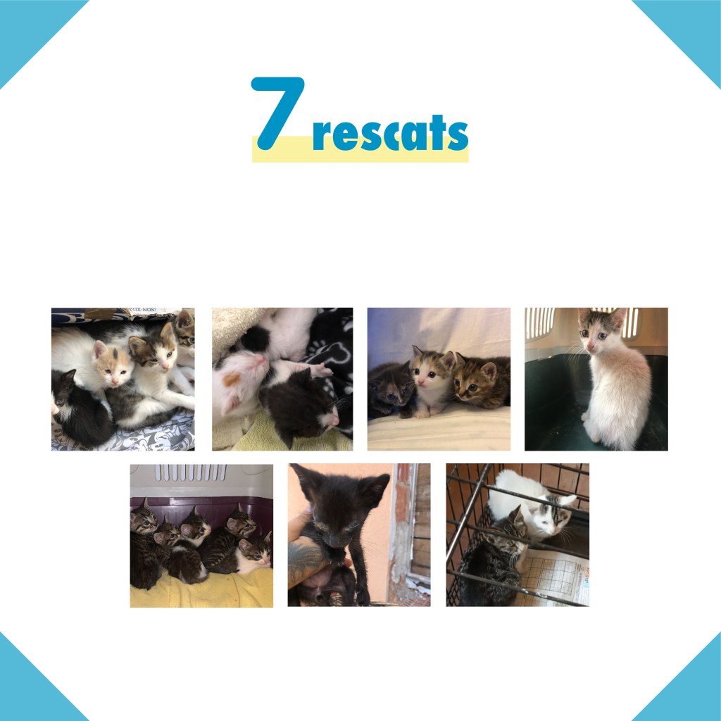 - 7 rescates. Este mes hemos hecho siete rescates de 19 gatos pequeños. Todos han sido acogidos por las socias de la asociación o personas que colaboran con nosotros.