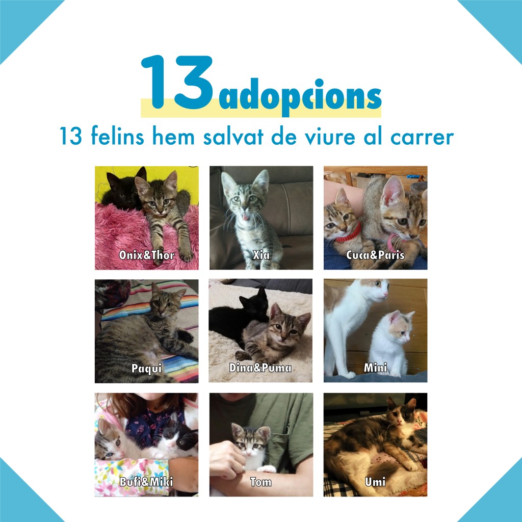 - 13 adopciones. 13 felinos procedentes de las colonias felinas que cuidamos han tenido suerte de ser adoptados por una familia responsable y no vivir nunca más en la calle.