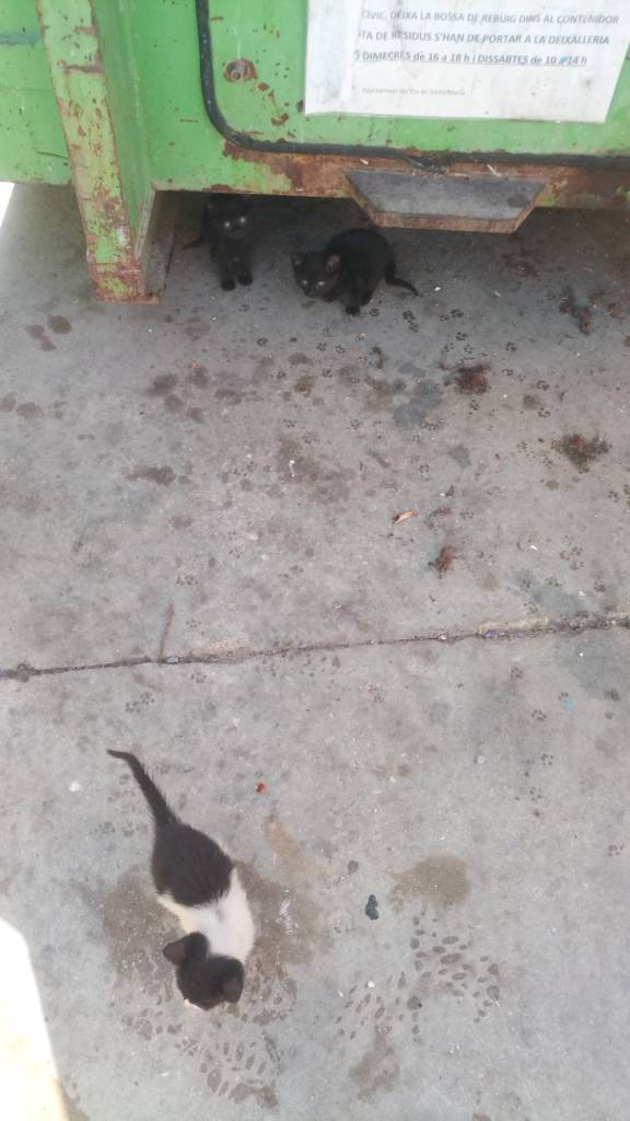 Hoy por la mañana nos hemos encontrado con tres pequeños abandonados (dos hembras y un macho), de un mes y medio de edad, a la zona de los contenedores de la Deixalleria. Sabemos que se trata de un abandono porque son muy dóciles, y los gatos que nacen y crecen en la calle no lo son.