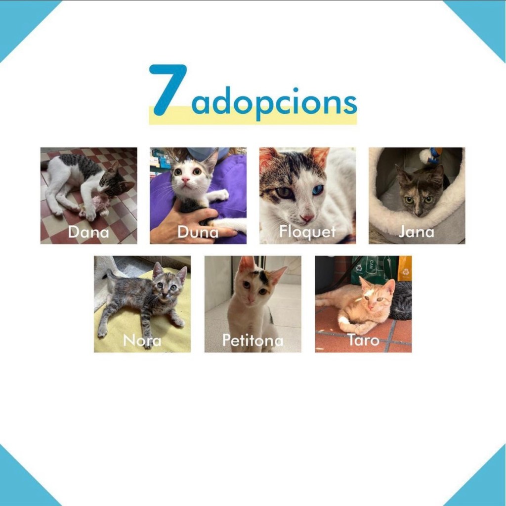 - 7 adopciones. Siete pequeños felinos han sido salvados de vivir a la calle y tener la oportunidad de vivir en una casa donde no les falte amor.