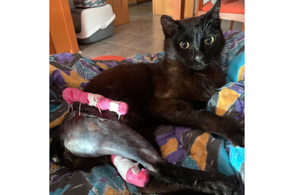Negret se encuentra con la pata operada, con unos hierros que la sostienen. Esperamos de todo corazón que mejore y pueda volver a andar otra vez.